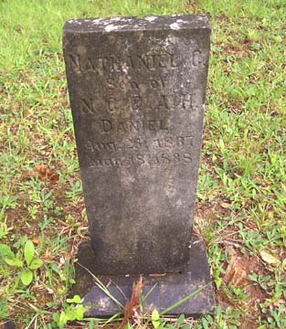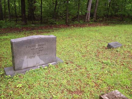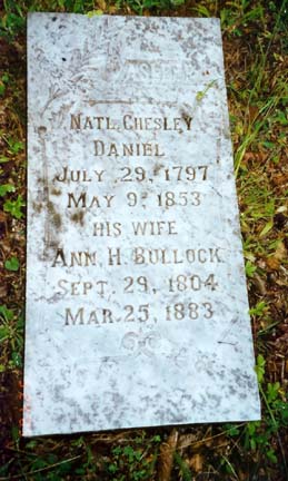 NATL. CHESLEY DANIEL JULY 29, 1797 MAY 9, 1853 HIS WIFE ANN H. BULLOCK SEPT. 29, 1804 MAR. 25, 1883 Nathaniel Chesley Daniel was the son of James Daniel, and grandson of Chesley Daniel the founder of Tranquility. The stone has fallen from its base.