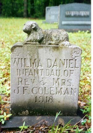 INFANT DAU. OF REV. & MRS. J.F. COLEMAN 1918 Wilma Coleman was the daughter of Sara Morton Daniel who was the daughter of Nathaniel Beverley Daniel and Harriet Bailey Bullock. Bill Seay explains: |