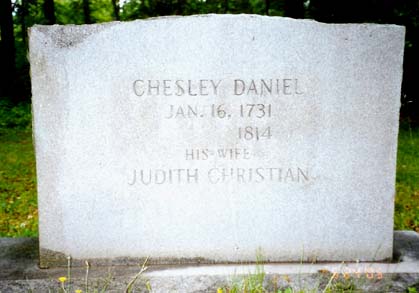 ![]() photo by Bill Seay CHESLEY DANIEL JAN. 16, 1731 1814 HIS WIFE JUDITH CHRISTIAN This is a newer stone, erected by descendants. |