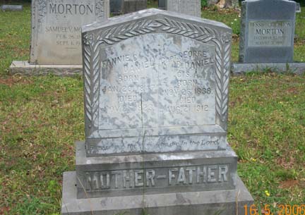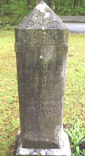 ![]() FANNIE C. DAUGHTER OF GEORGE & FANNIE C. DANIEL WIFE OF JAS. T. MORTON JUNE 11, 1868 MAR. 29, 1944 |