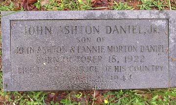 ![]() JOHN ASHTON DANIEL, JR. SON OF JOHN ASHTON & FANNIE MORTON DANIEL BORN OCTOBER 18, 1922 DIED IN THE SERVICE OF HIS COUNTRY OCTOBER 21, 1944 |