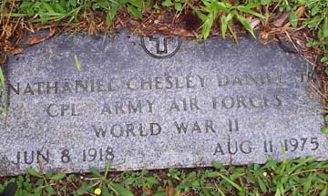 ![]() NATHANIEL CHESLEY DANIEL, JR. CPL. ARMY AIR FORCES WORLD WAR II JUN 8 1918 ;  ;  AUG 11 1975 Nathaniel Chesley Daniel, Jr. was the son of Nathaniel Chesley Daniel and Annie Taylor. |