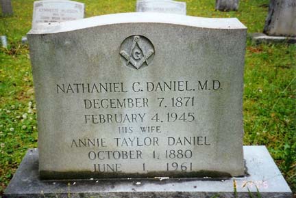 NATHANIEL C. DANIEL, M.D. DECEMBER 7, 1871 FEBRUARY 4, 1945 HIS WIFE ANNIE TAYLOR DANIEL OCTOBER 1, 1880 JUNE 1, 1961 Nathaniel C. Daniel, M.D. was the son of George Bullock Daniel and Fannie Crichton |
