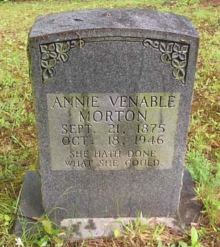 ![]() ANNIE VENABLE MORTON SEPT. 21, 1875 OCT. 18, 1946 SHE HATH DONE WHAT SHE COULD. |