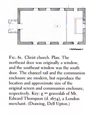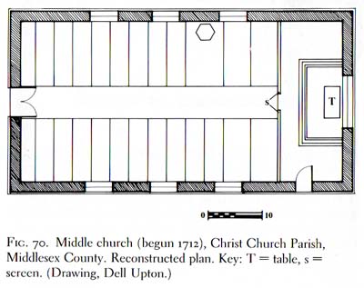| Below are the plans of the building as drawn by Dell Upton in Holy Things and Profane. Fig. 61 is the current layout, Fig. 70 is the reconstructed plan based on primary documents. The change in the original southeast corner door (now a smaller window) and the addition leading from the northeast door (originally a window) can be seen from outside in the pictures following. Note that the northeast window described as original in Fig. 61 does not actually show up in the plan reconstructed from primary source descriptions. | |