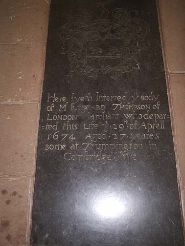 Here lyeth Interred ye body of M Edward Thompson of London Marchant who departed this Life ye 29th of Aprell 1674 Aged 27 yeares Borne at Trumpington CambridgeShire Others noted as buried inside the church (but there aren't markers for them):