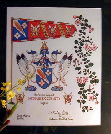 These were designed by the College of Arms, London, and given to the County of Middlesex by the Bank of Middlesex. They were presented by the British Herald of Arms in 1977. |