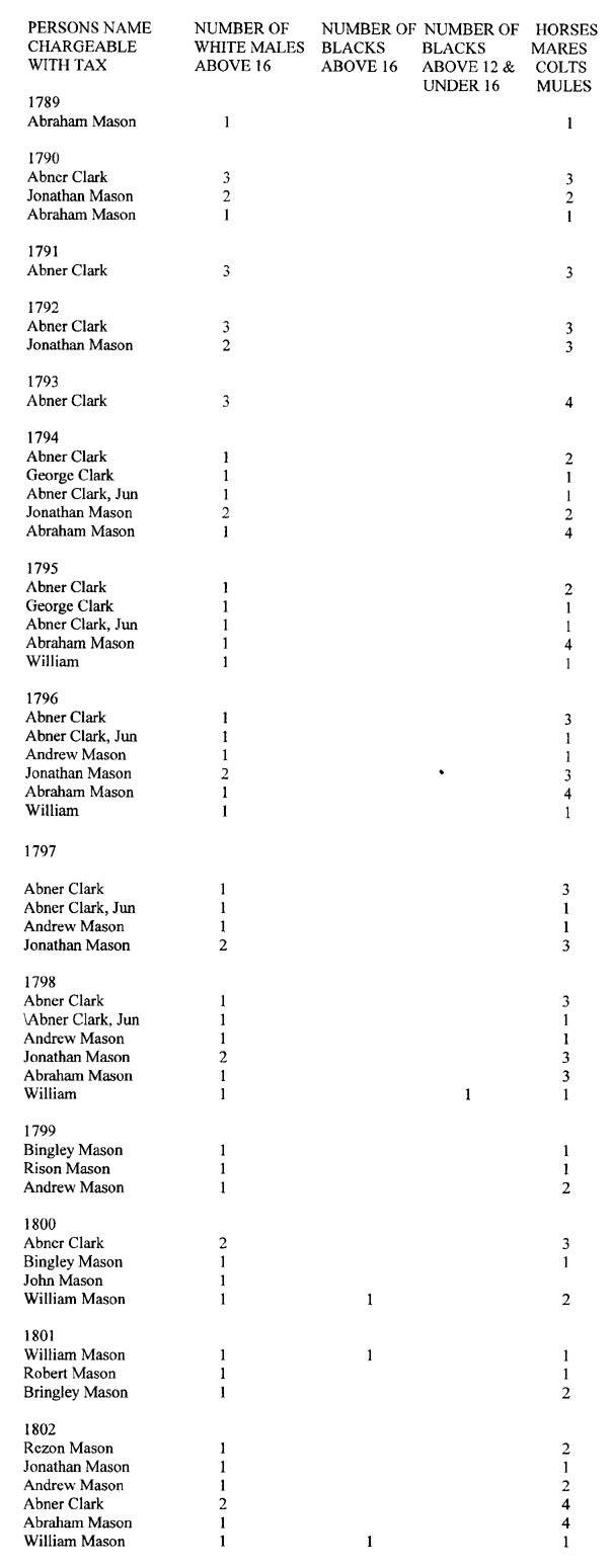 Francis Mason provides the Mason and Clark listings from the Personal Property Tax Lists of Frederick County for the years 1789-1802, from the microfilms at the courthouse (the LDS film # for these taxes is 2024545.). Francis believes the list is incomplete but shows the records that he could find. [Click on the image to enlarge if necessary. Use your "back" button to return to this page.]